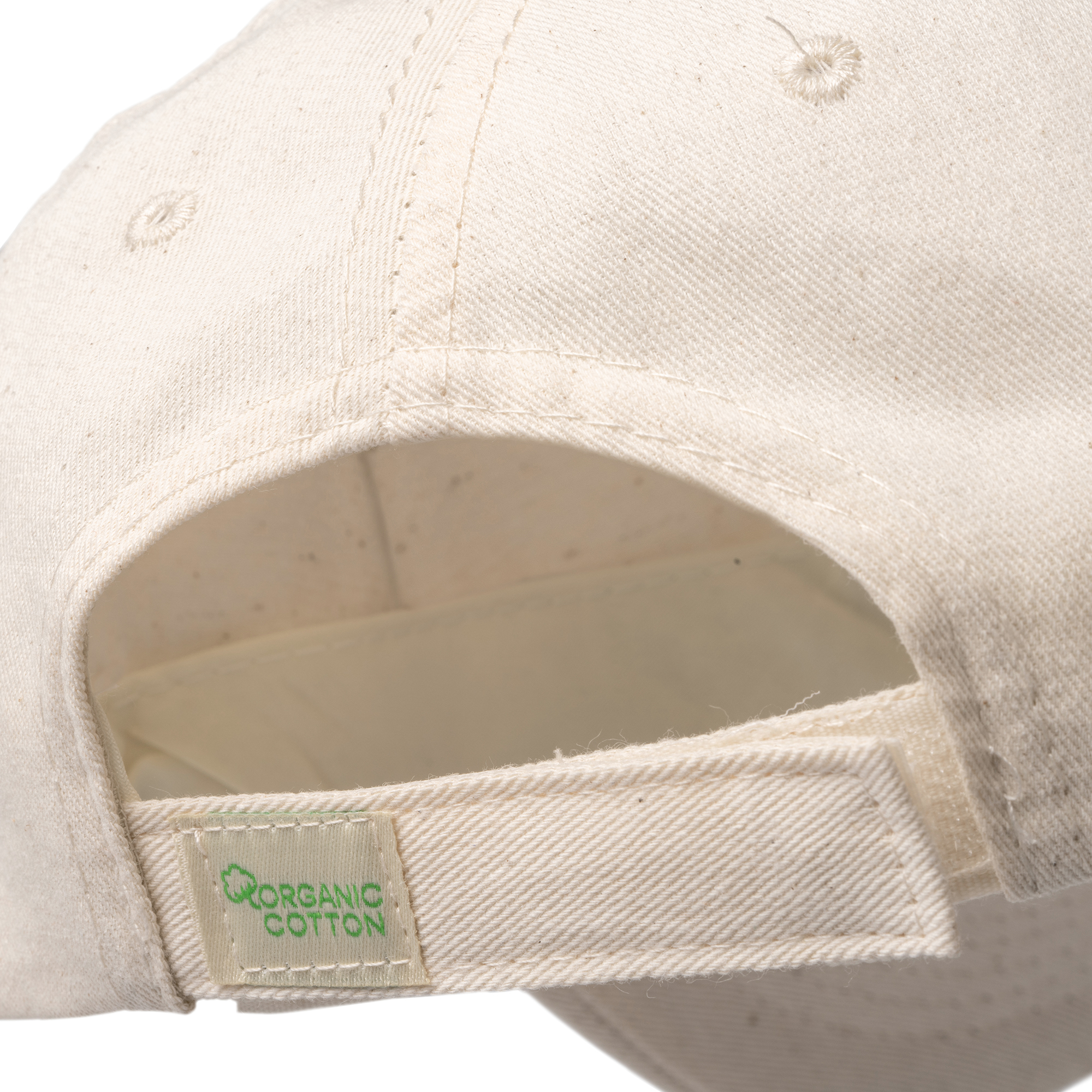 Gorra de 5 paneles 100% algodón orgánico. Cierre de velcro ajustable y orificios de ventilación.